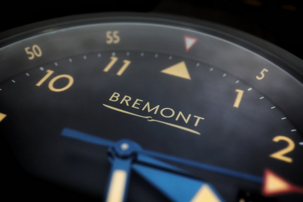 The barrel of the case is a knurled and there are two crowns, at 2 and 4 o’clock for setting the time and rotating the inner bezel respectively. These crowns are signed with Bremont’s propeller logo (at 2 o’clock) and a black and silver RAF roundel at 4 o’clock. Turning the inner bezel is a deeply satisfying experience. Bremont’s roto-click bezel offers a very positive and solid feeling click.