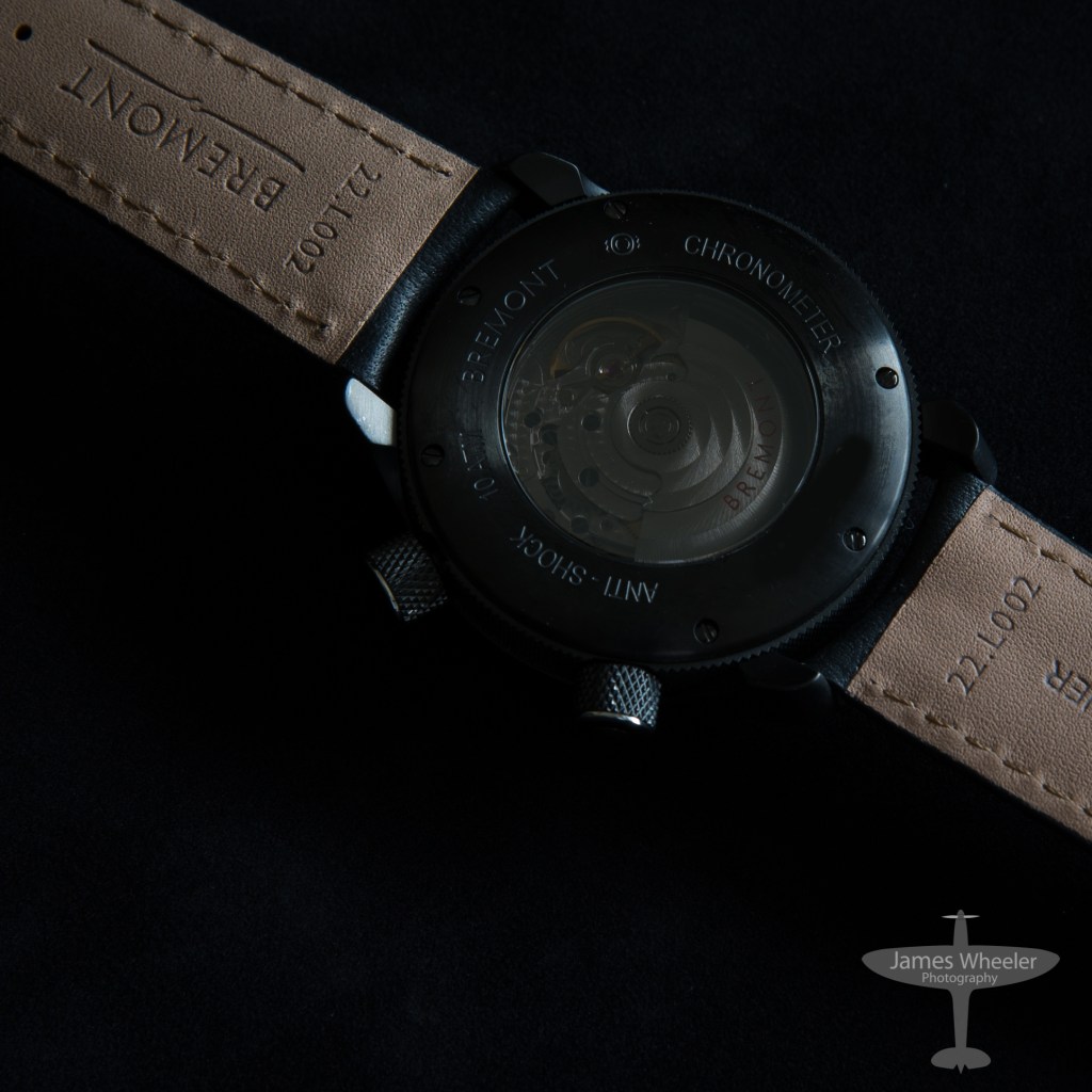 The movement is listed as BE-36AE which is a modified ETA 2836-2 with 38 hour power reserve. The modified Bremont rotor can be seen through the smoked sapphire case back (another stealthy feature) and is COSC certified.